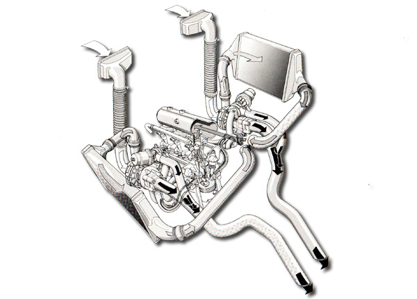 - Canalisations d’échappement du moteur aux deux turbocompresseurs parfaitement symétriques.